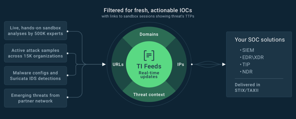 ANY.RUN tarafından sağlanan TI Feed’leri, sistemlerinizi özel IOC’lerle gerçek zamanlı olarak güncel tutar