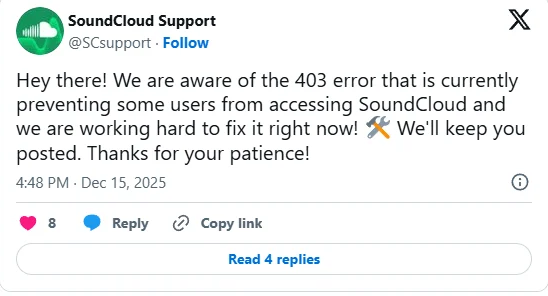 SoundCloud, X’teki (eski adıyla Twitter) bir gönderide, sistemlerini güçlendirmek için yeni yapılandırma değişiklikleri uygulamaya koydukları için bu geçici sorunların, acil güvenlik müdahalelerinin talihsiz bir yan etkisi olduğunu açıkladı. Şirket bu erişim sorunlarını çözmek için aktif olarak çalışıyor.
