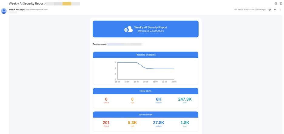 This service provides automated, AI-driven security analysis by combining Wazuh Cloud with advanced machine learning models. It processes security data at scale to generate actionable insights that strengthen an organization’s overall security posture.
