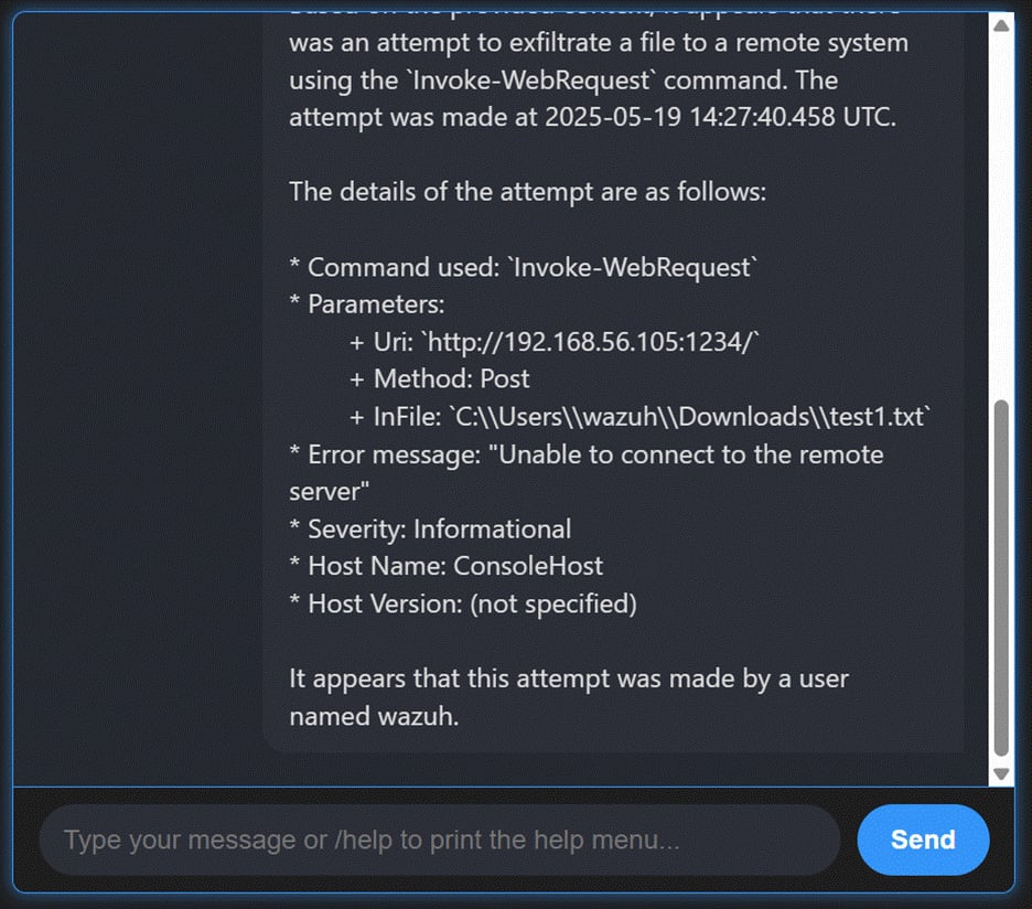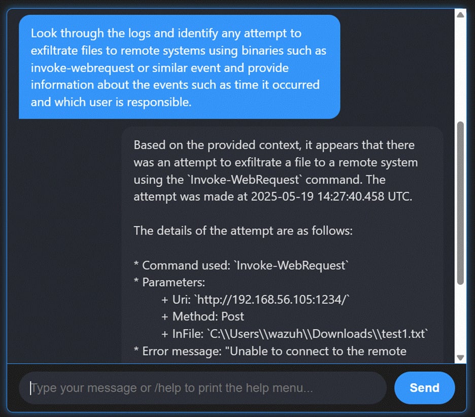This approach allows Wazuh to uncover threats that might otherwise remain hidden while enabling retrospective investigations. By embedding conversational AI into hunting workflows, Wazuh gives analysts an efficient way to ask more profound, more flexible questions of their data.