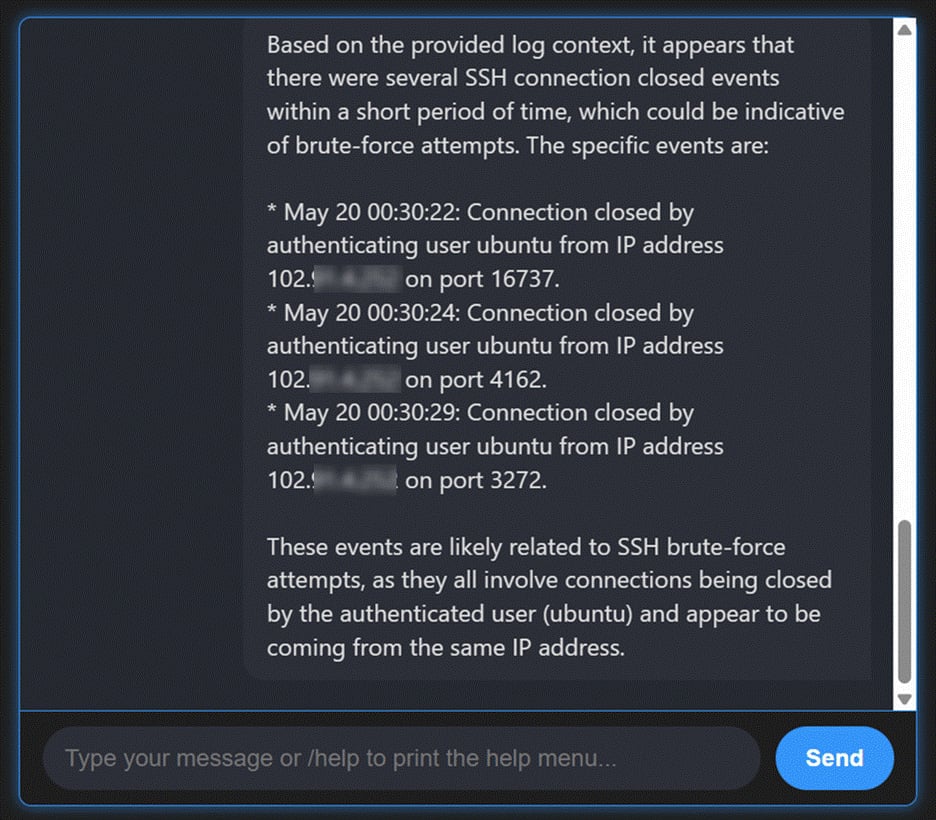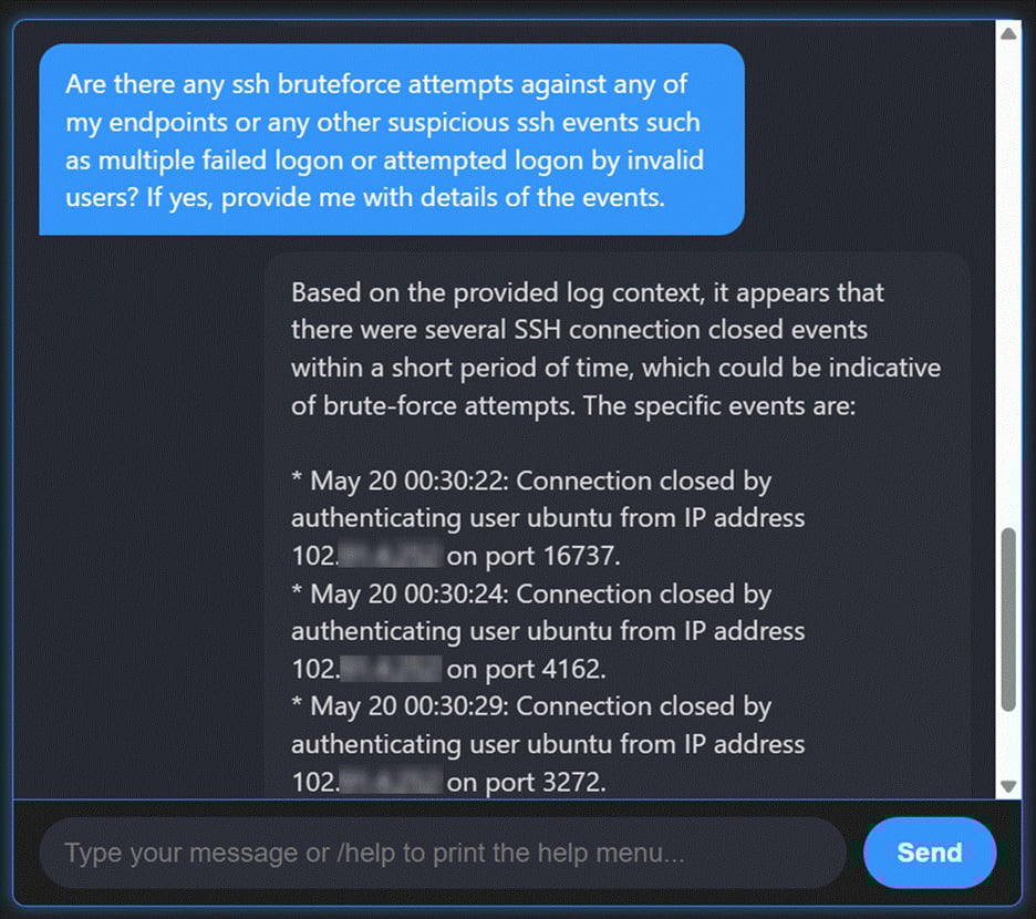 Prompt example: “Identify SSH brute-force attempts last week.”