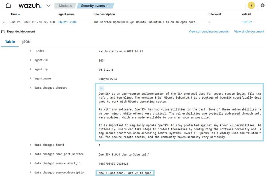 The Nmap and ChatGPT security auditing with Wazuh blog post shows how integrating Nmap scans with ChatGPT allows analysts to uncover more than just “what is open”. Wazuh can run periodic Nmap scans through its command monitoring modules, collecting outputs of open ports and the corresponding service versions. This data is then sent to ChatGPT (via API), which returns enriched information about each open service, including potential vulnerabilities and remediation guidance.