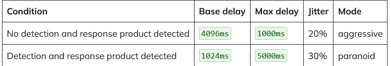 Paranoyak modda, davranışsal uyarıların tetiklenmesini veya çalışma zamanı tarayıcıları tarafından işaretlenmeyi önlemek için etkinliğini yavaşlatır ve check-in’leri (kalp atışları) arasındaki süreyi artırır.